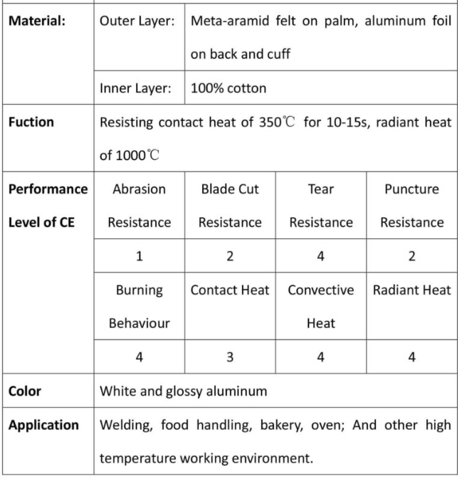 - Đặc điểm : Găng tay được làm bằng chất liệu sợi vải tổng hợp Meta-Aramid chịu được nhiệt độ lên đến 350 độ C gồm nhiều lớp chống nhiệt, hấp thụ mồ hôi tốt, độ bền cao