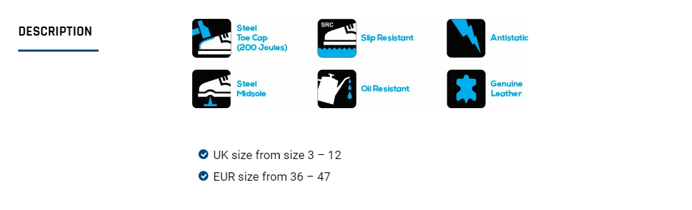 - Tiêu chuẩn: tiêu chuẩn Châu Âu - CE, tiêu chuẩn EN ISO 20345 S1P, tiêu chuẩn Mỹ - PNS ASTM F 2413:2006 EN 20345 S3